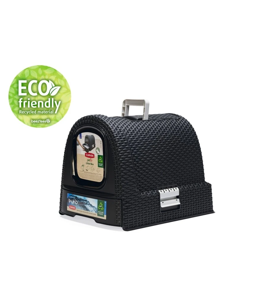 De Curver Kattenbak bestaat voor 95% uit gerecycled materiaal (huishoudelijk plastic afval en oude visnetten op de bodem van de zee (ocean waste)). De hele kattenbak is op zijn beurt ook weer 100% recyclebaar.